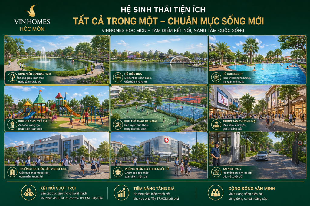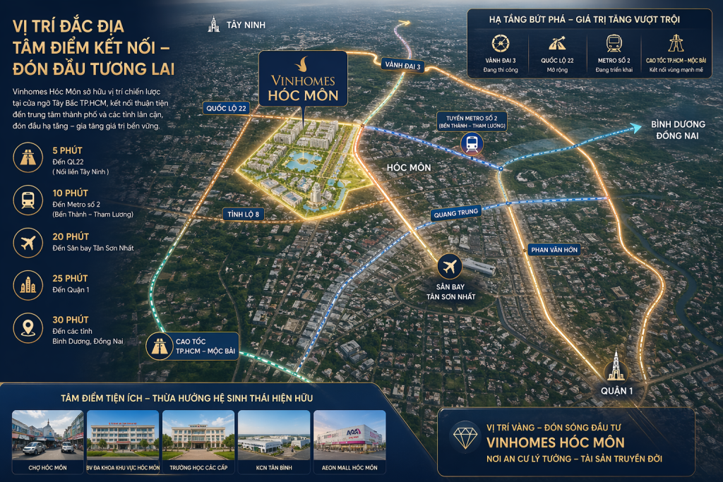 Ngoài ra, vị trí của Vinhomes Hóc Môn cũng là một lợi thế lớn khi dễ dàng kết nối với trung tâm TP.HCM và các khu vực lân cận. Hạ tầng giao thông ngày càng hoàn thiện giúp việc di chuyển trở nên thuận tiện, đồng thời gia tăng tiềm năng đầu tư trong tương lai.
